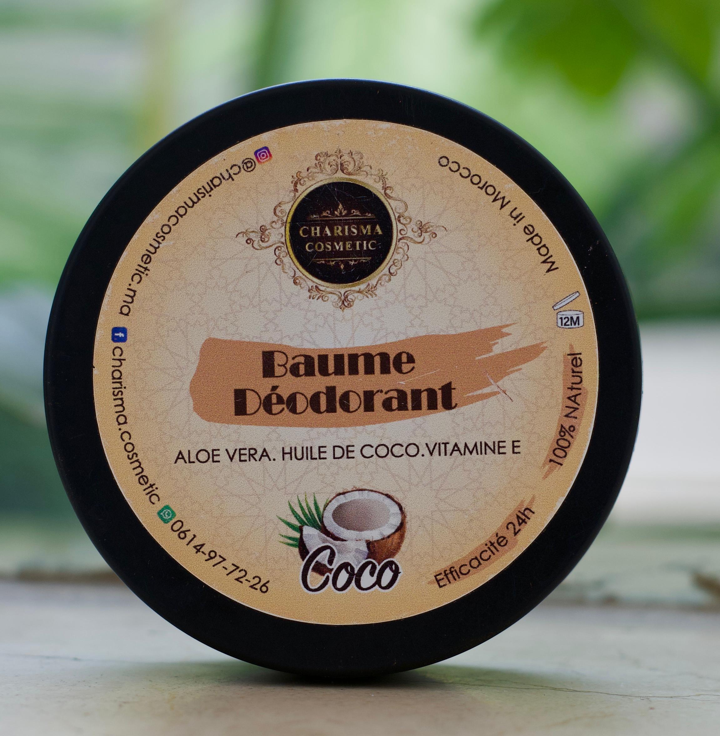 Natural coconut deodorant balm with aloe vera and vitamin E for 24h freshness, 100% natural.