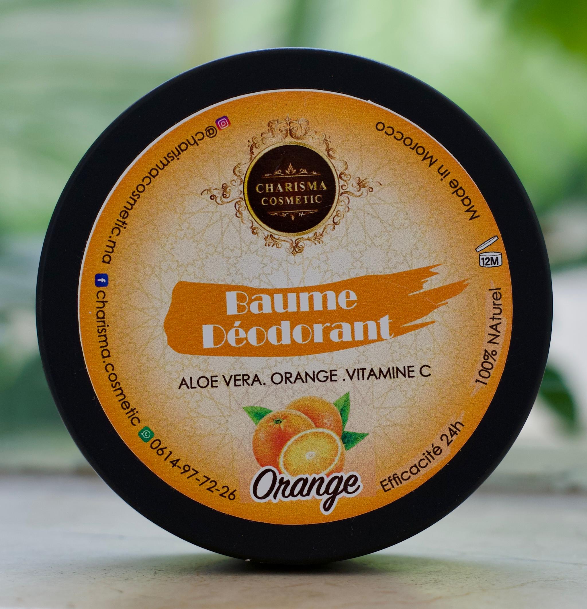 Citrus-fresh orange deodorant balm with aloe vera and vitamin C for natural 24h freshness.