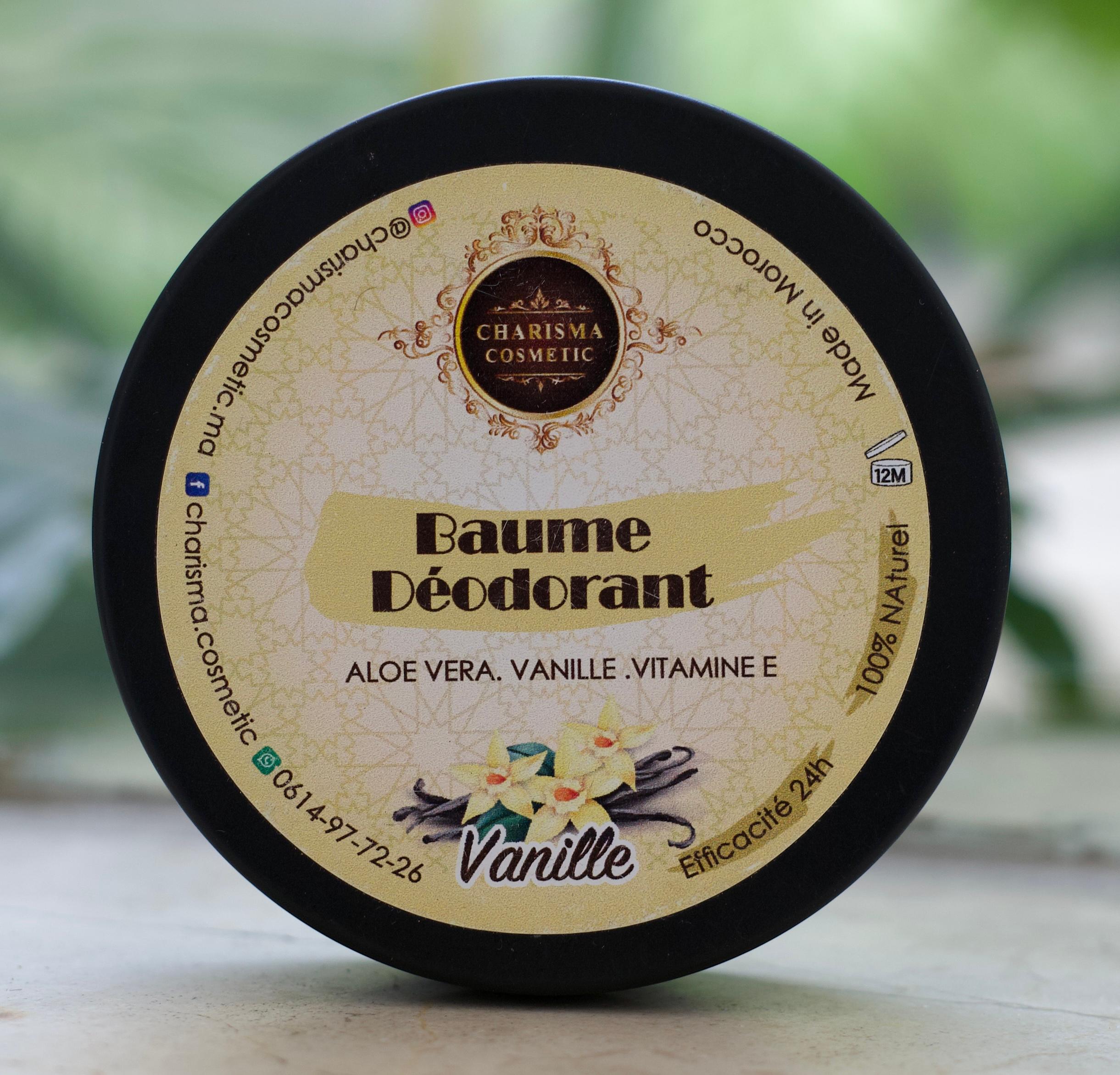 Vanilla-infused deodorant balm with aloe vera and vitamin E for soft skin and lasting comfort.
