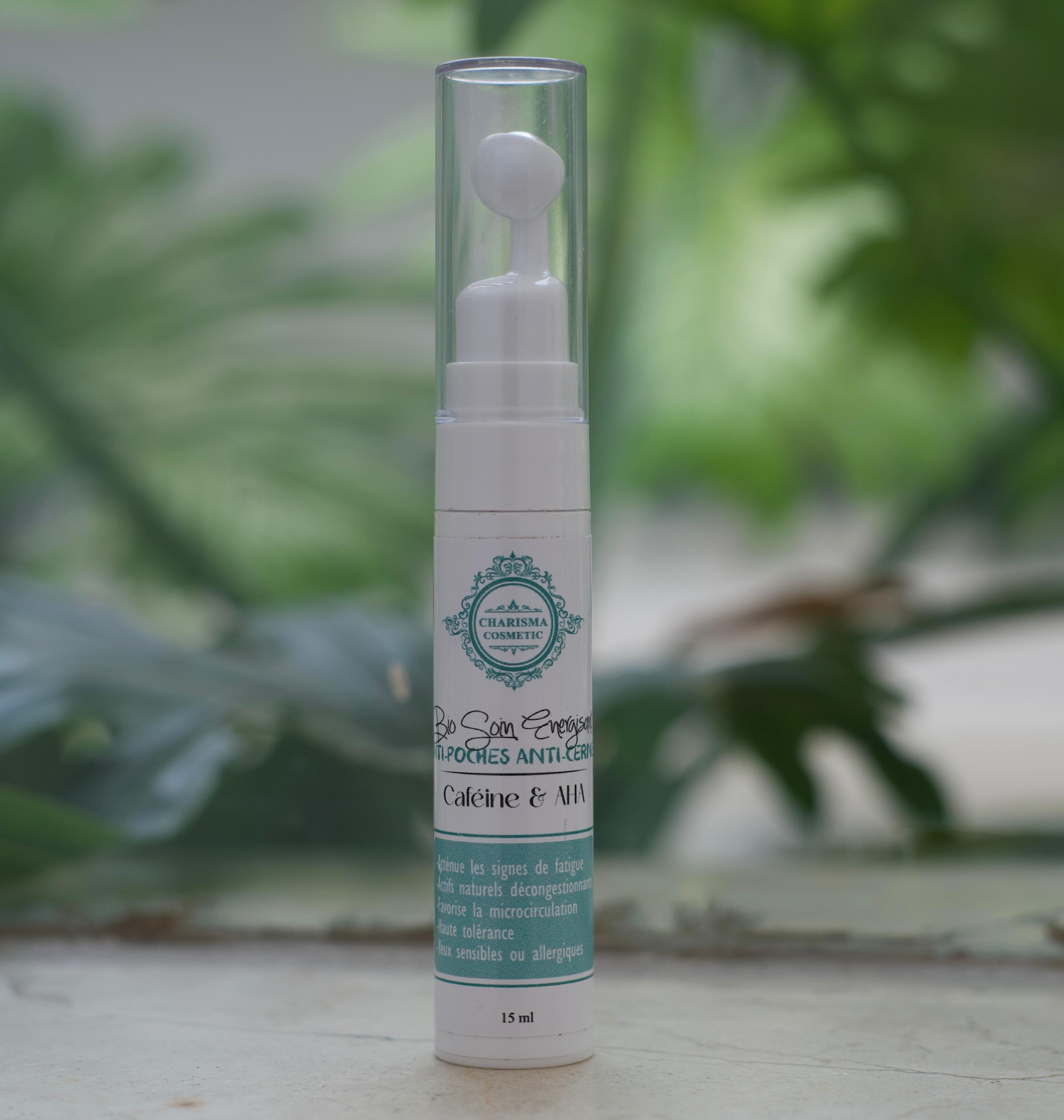 Caffeine and AHA eye serum with a cooling applicator to decongest, boost microcirculation, and reduce fatigue signs.